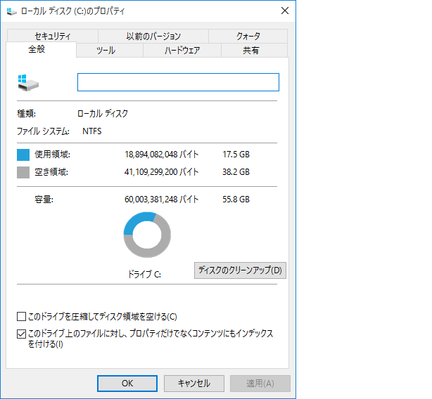 こうなりました。使用している領域は20GB未満となり空きが40GBもあります。カタログ値の総容量は64GBです