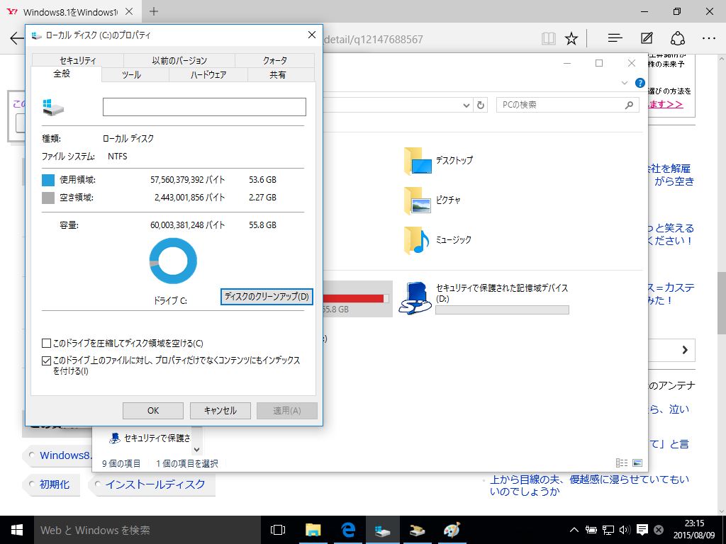 しばらくするとディスクの不要ファイルが表示されます。Windows10はアップグレード後30日間ならいつでも以前のOSに戻すことができます。そのために以前のWindows環境やファイル・アプリなどをディスクに保存されているのです。この以前のWindows環境はディスクの容量を圧迫しているのは間違えありません。見てください私はメイン機として利用していないWindows8.1でも約33GBもの容量を消費しています。これは削除しましょう。チェックしてみると全体で約37GBの空きを確保できます。いざ実行!! 私は必要なファイルはクラウドにバックアップしています。皆さんもバックアップしてから実行してくださいね。