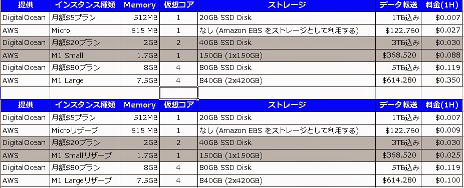 クラウドの新星 格安DigitalOceanをAWSと比較してみた 日常の出来事 X Facebook はてブ Pocket LINE コピー 2013.07.01 ネットニュースに クラウド・ホスティングに新星―DigitalOceanはシンプルさと低料金を武器にAWSに挑戦する DigitalOceanのサイトから 最小構成で1時間$0.007 電気代より安いかもね DigitalOceanの資料 確かに、安い DigitalOceanとAWSを比較してみました。 上段は、AWSがオンデマンドインスタンス 下段は、AWSがリザーブドインスタンス リザーブドの場合はAWSの方が安い しかし、AWSの場合はデータ転送での課金が大きなウェイトを占めるので仮想マシンだけならDigitalOceanが安いことになる データ転送を含めるとDigitalOceanの優位性が上になる 日本での利用だと米国や欧州へのアクセスになるのでちょっと遅いかもね 早く日本に上陸して欲しい DigitalOceanの求人へ募集したい まぁ 無理か 英語出来ないから