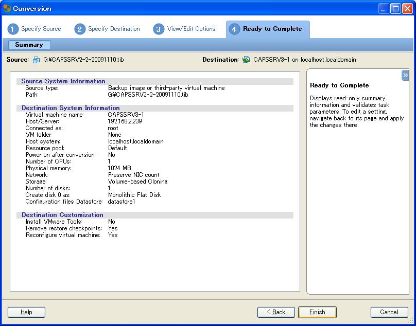 あとは、 vSphere Clientで仮想ホストを起動してみてください ただし、NICなどの設定は引き継がれます仮想環境のネットワークに同一IPなどがないか等を確認してくださいTrueImageでバックアップする際に対象サーバのNICをDHCPや無効にしておいたほうが良いと思います