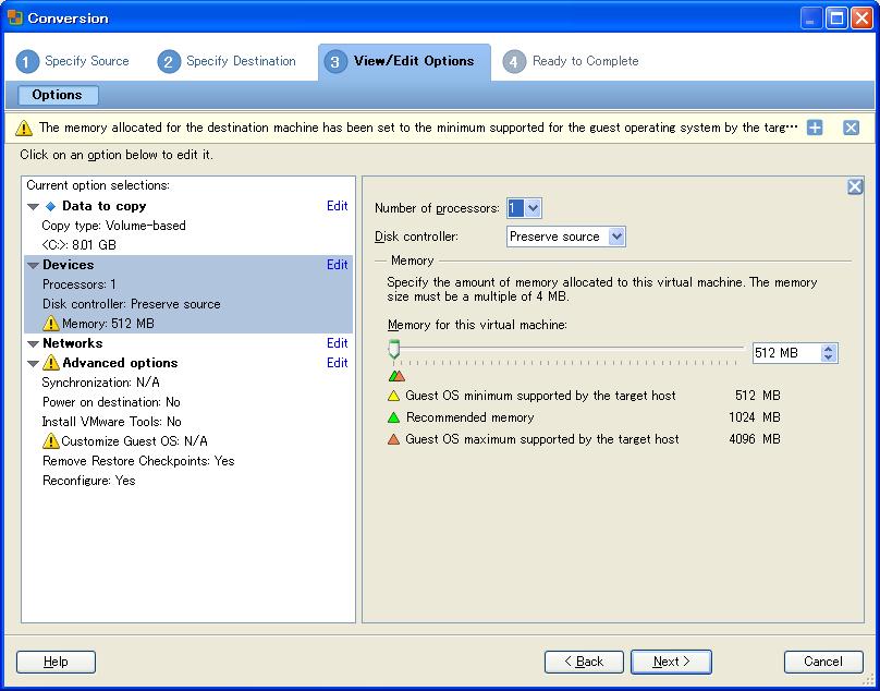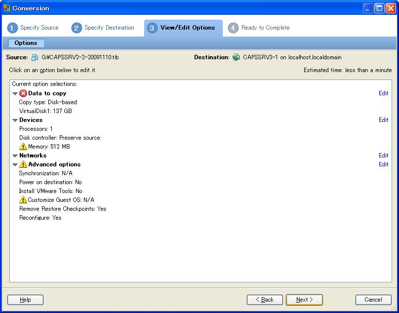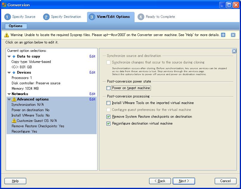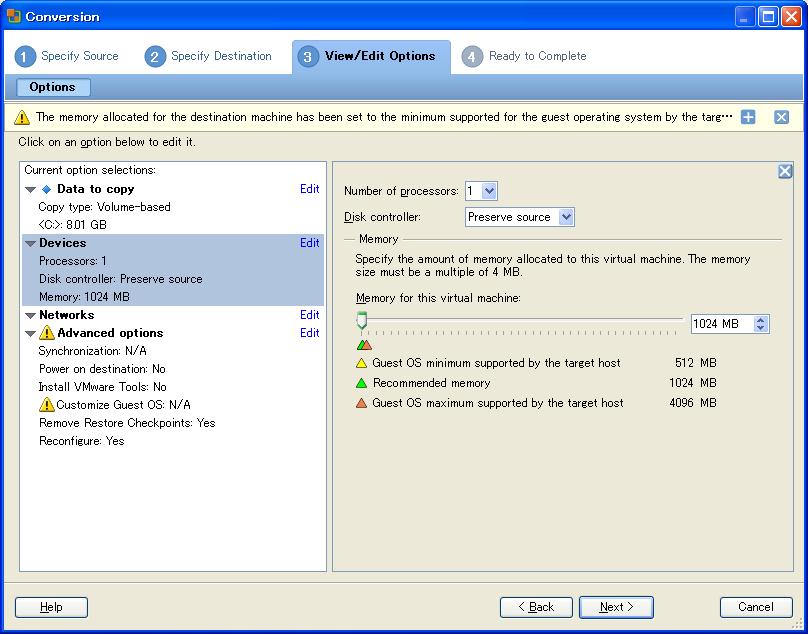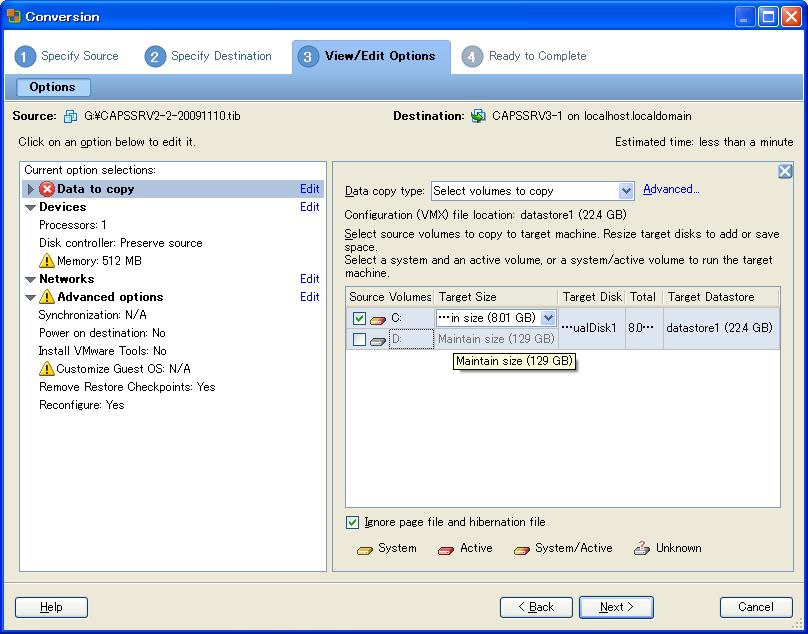 ConvertのOptionを指定しますConvert先のESXiサーバのリソースと相談して、HDD・メモリを調整しますが、HDDに関してはOS・データとディスクスライスが違う場合はそれぞれを戻す設定をしなければいけません※HDDイメージだと例えば130GBのHDDまるまるを戻そうとすると仮想サーバの仮想HDDが130GB必要になるのではないかと思っています(試していないのでわかりません)