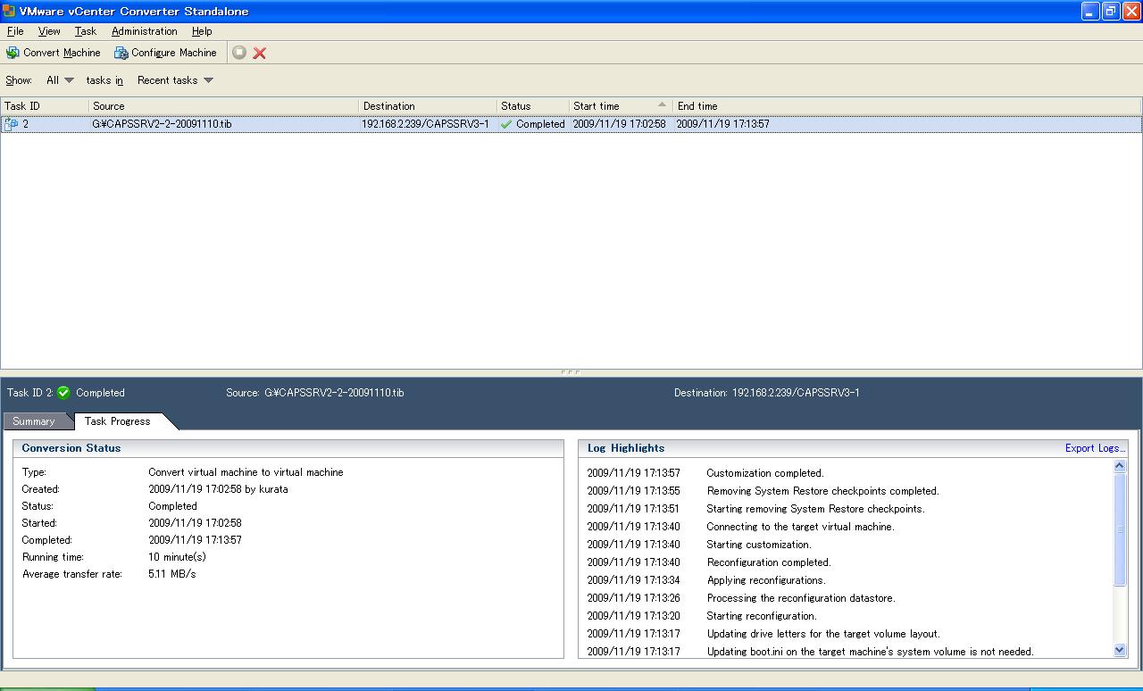 ステータスを確認することができますが、私は動いているのか 止まっているのか 確認できませんでしたしばらくしたら、画面に”Completed”と表示が出ておりましたvSphere Clientにもステータスが表示されますので、両方確認すれば、良いと思います